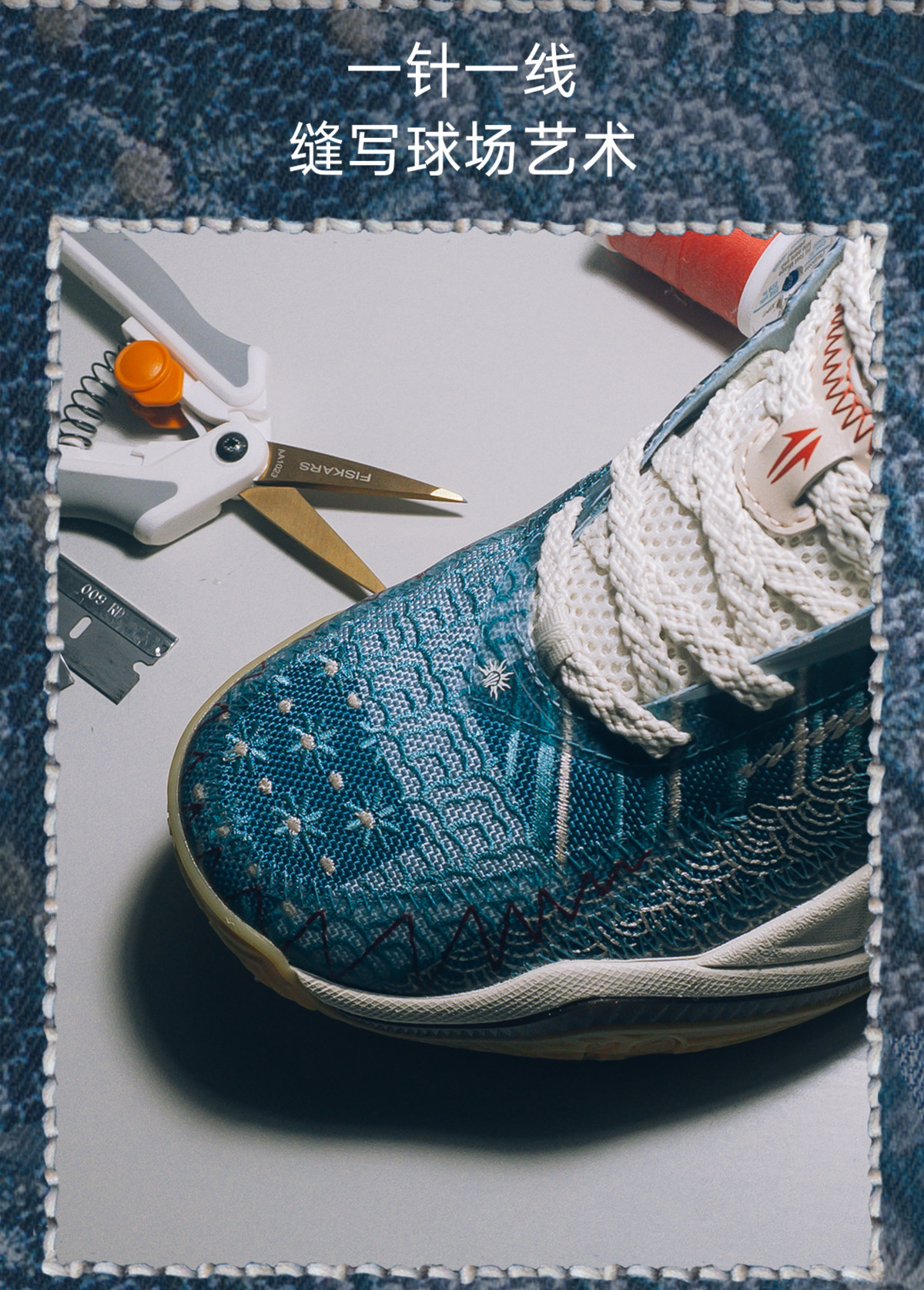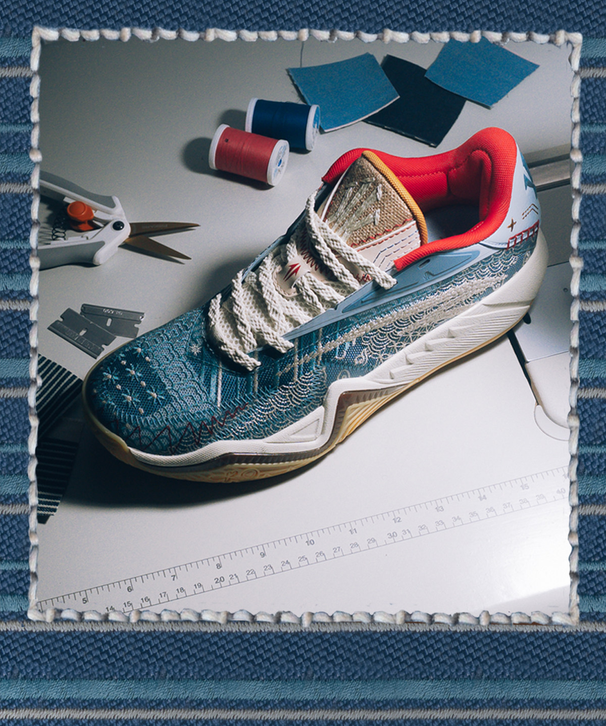 Inspiration: The Anta Kyrie Irving KAI 3 Basketball Shoes – Patchwork draw inspiration from African American quilting traditions. The upper features a patchwork base in varying shades of blue, complemented by sashiko-inspired textures and embroidered motifs of auspicious clouds and floral patterns, faithfully recreating a handcrafted aesthetic.