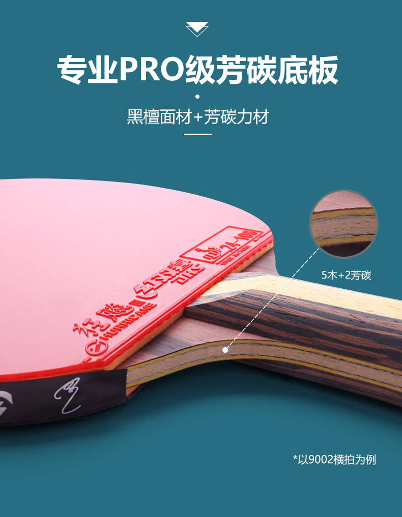 DHS 9-Star Hurricane Long Handle Flared Table Tennis Racket. Professional single racket for advanced players. Ebony & ALC Carbon blade, Hurricane 3 & 8 rubbers, weight approx. 222g. Includes racket case + 6 table tennis balls.