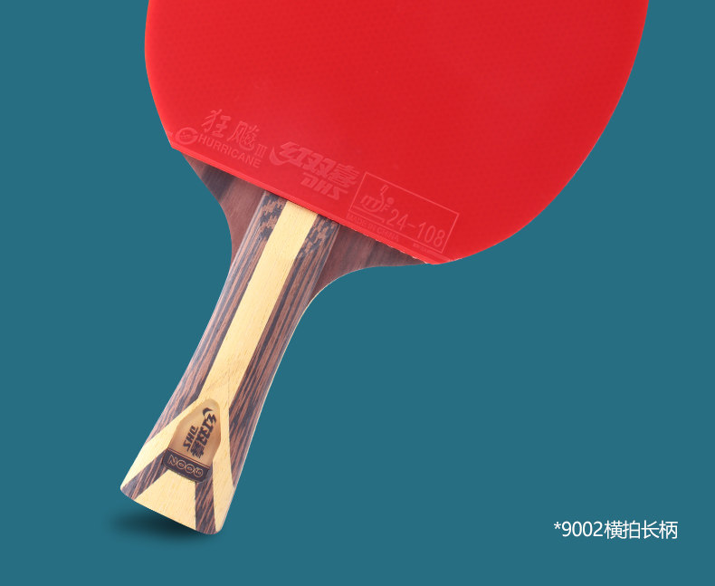 DHS 9-Star Hurricane is DHS’s top-level pre-assembled table tennis racket, designed for advanced amateur players, professional training and competitive matches. This model is the Long Handle Flared (horizontal grip) version.