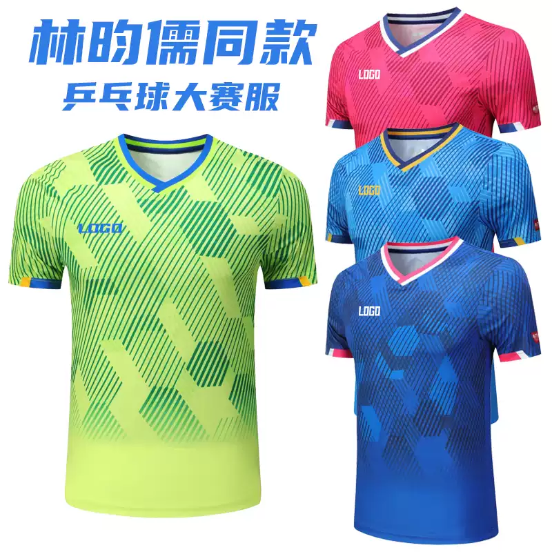 Lin Shiru replica table tennis competition jersey, available in green, blue, pink, purple and black. Quick-dry, breathable fabric for training and matches, with custom logo printing for men, women, and kids.