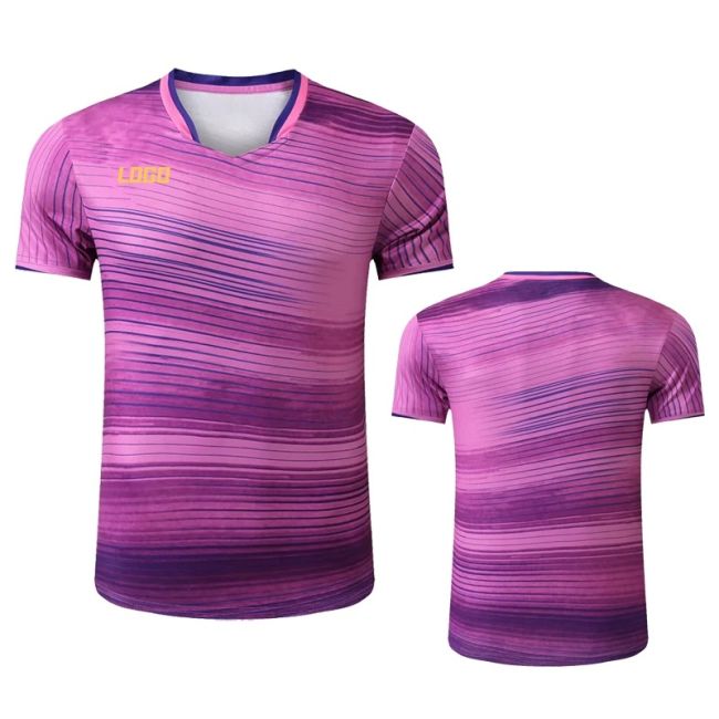 This premium table tennis jersey is the exact replica worn by rising star Lin Shiru in major competitions. Featuring a bold gradient and geometric pattern design, it is available in four vibrant colors: green, blue, pink, purple and black. Crafted from high-performance quick-dry fabric, it effectively wicks away sweat and moisture, keeping you cool and comfortable during intense matches and daily training. The lightweight, stretchy material ensures unrestricted movement for all strokes, while the ergonomic V-neck cut provides a comfortable fit for both men, women, and kids. Ideal for competitive play, training, and fan wear, this jersey can be customized with your team logo, name, and number to create a unique and personalized look. Whether you’re a professional athlete or a dedicated fan, this jersey combines style and performance for the ultimate table tennis experience.