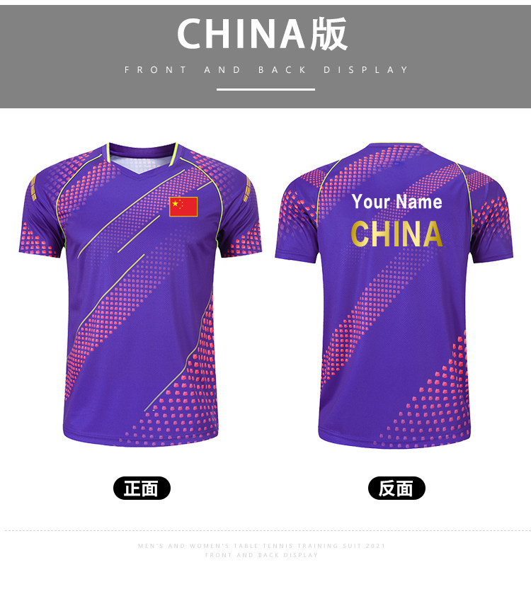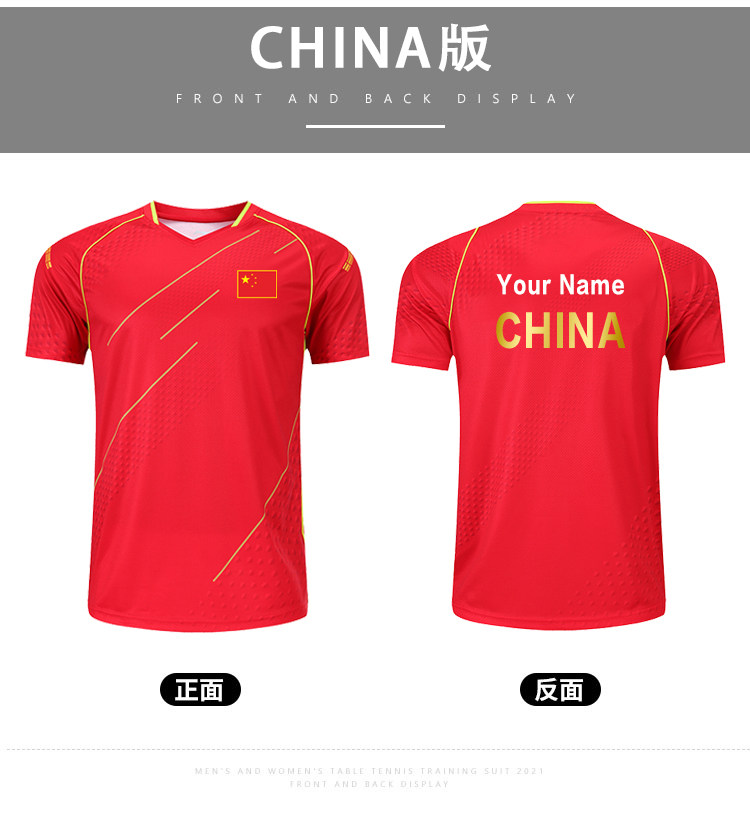 Official China National Team World Championships table tennis jersey, same style worn by top players at the China Open. Made of premium breathable polyester with quick-dry performance. Fully customizable with player names, numbers, sponsor logos and national flag printing.