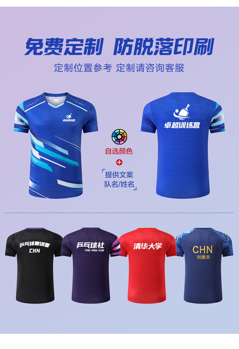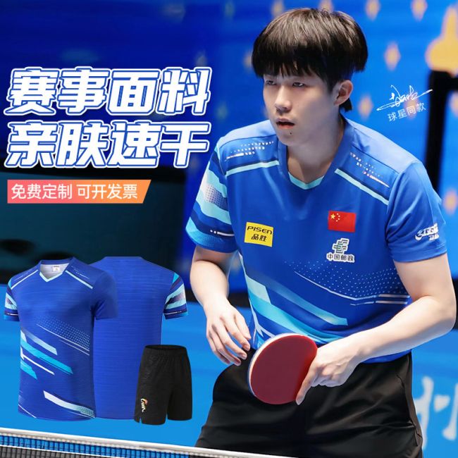 2024 Paris Olympics China National Team Table Tennis Uniform Set – Authentic replica of the gear worn by Fan Zhendong at China Open and international competitions. Crafted from 90% polyester/10% spandex for breathable, skin-friendly comfort. Fully customizable with player names, numbers, sponsors, and national flag printing. Available in blue for men and women.